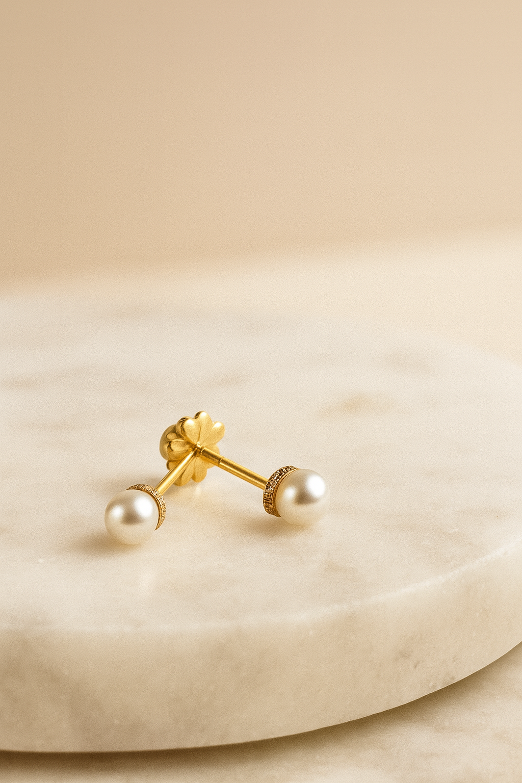 Aro de perla cultivada en oro 18K con casquillo y cierre de tuerca tope, diseñado para ofrecer seguridad, comodidad y elegancia. Una joya clásica y delicada que combina la pureza de la perla con la calidad del oro, ideal para uso diario y permanente.