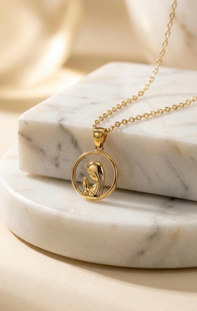 - Diseño: Medalla circular con relieve de Virgen María niña; cadena de eslabones finos
