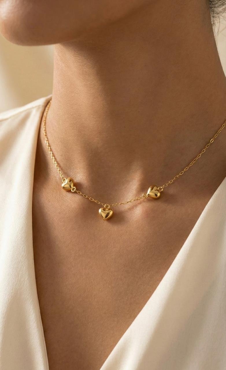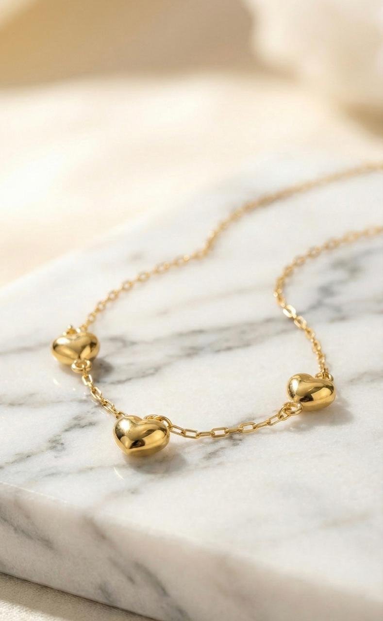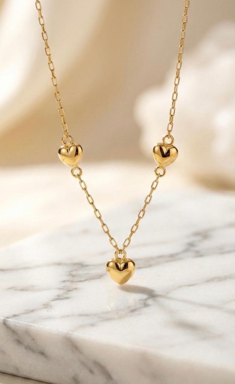 - Diseño: Cadena tradicional con 3 corazones laterales de 7 mm y un corazón central de 8×8 mm